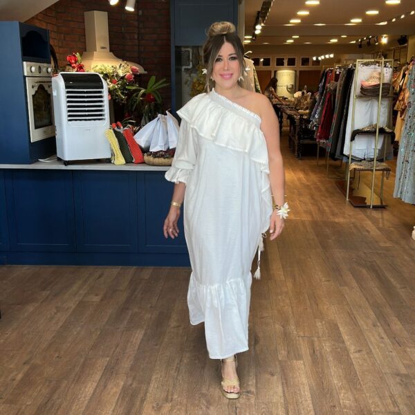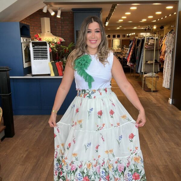 Bel Lastikli Desenli Beyaz Uzun Etek