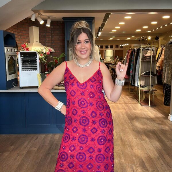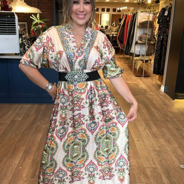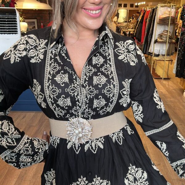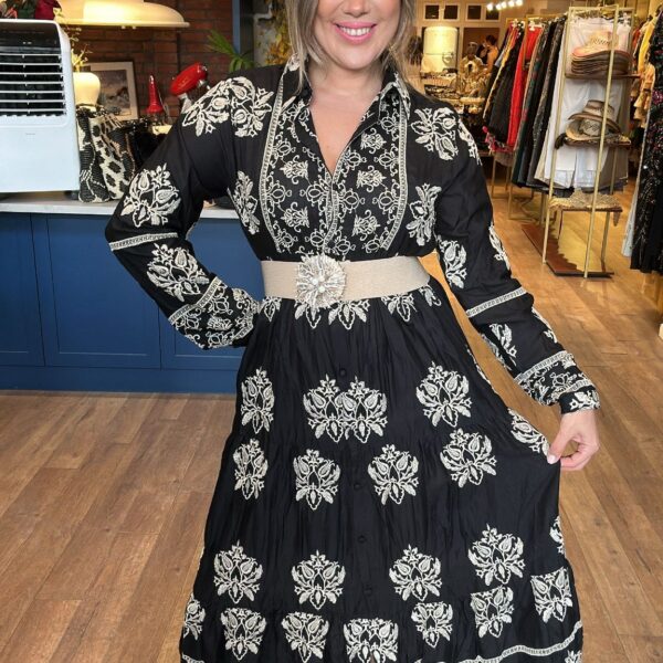 Yakası Taş İşlemeli Desenli Uzun Elbise