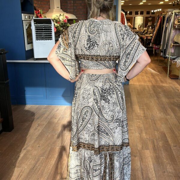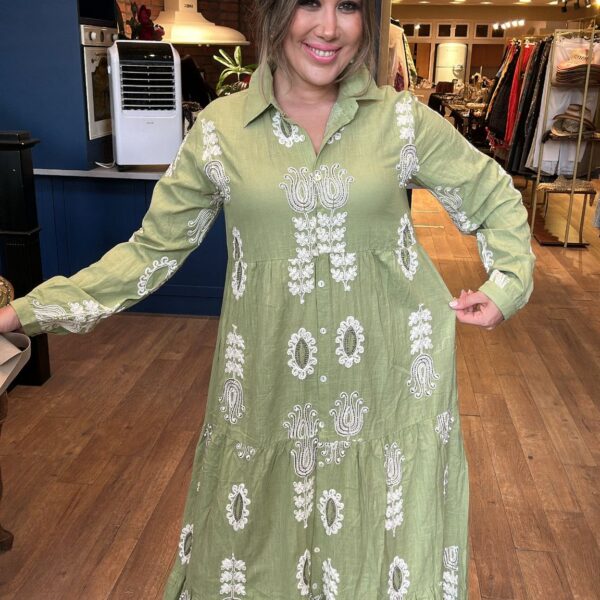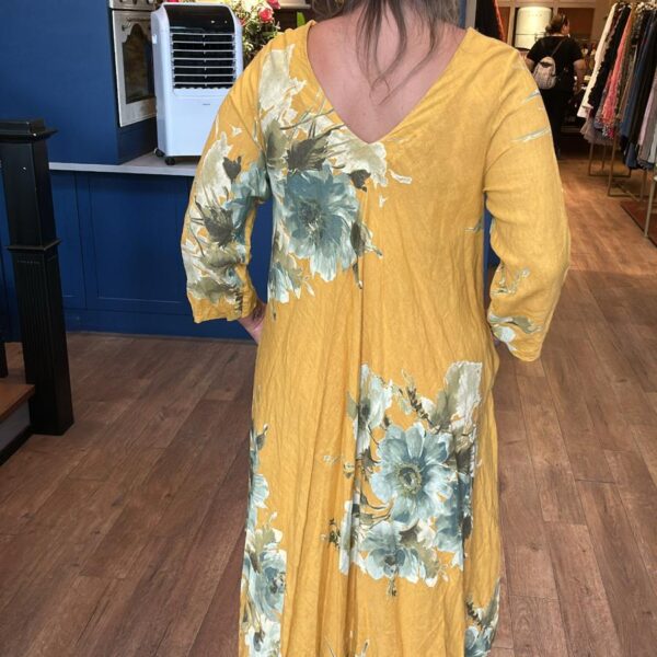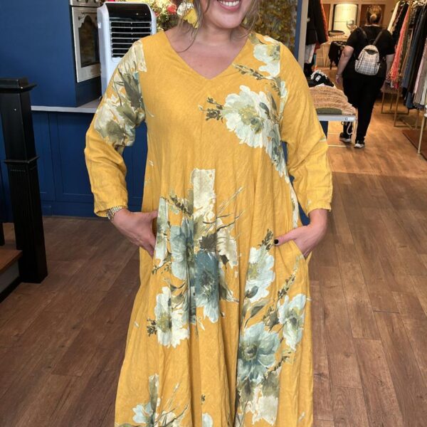 V Yaka Rahat Kesim Desenli Uzun Keten Elbise