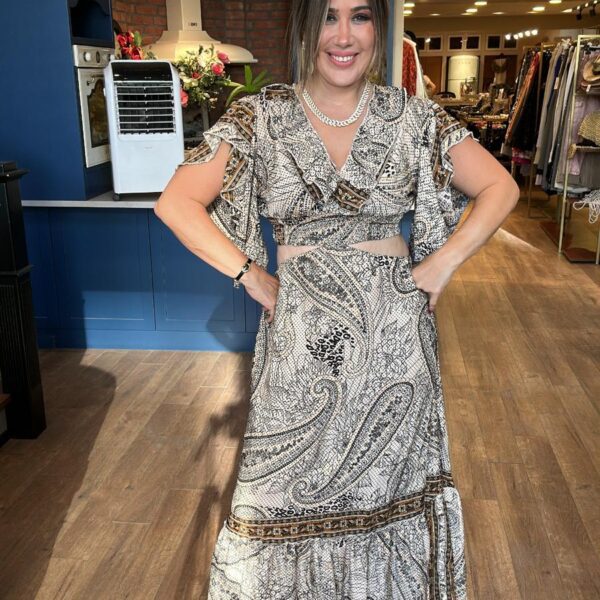 Sırt Dekolteli Desenli Yaka Fırfırlı Elbise