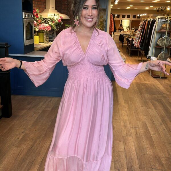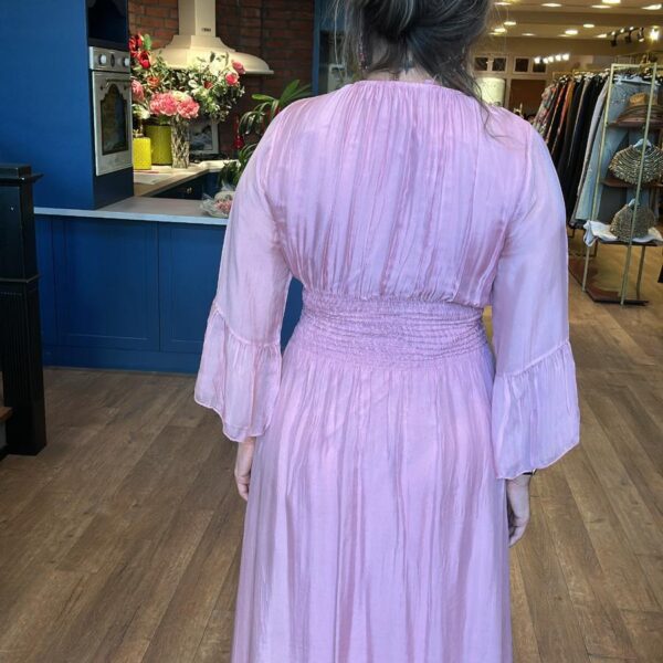 Sırt Detaylı Bağlamalı Pembe Desenli Elbise
