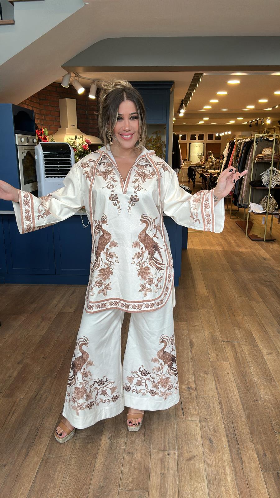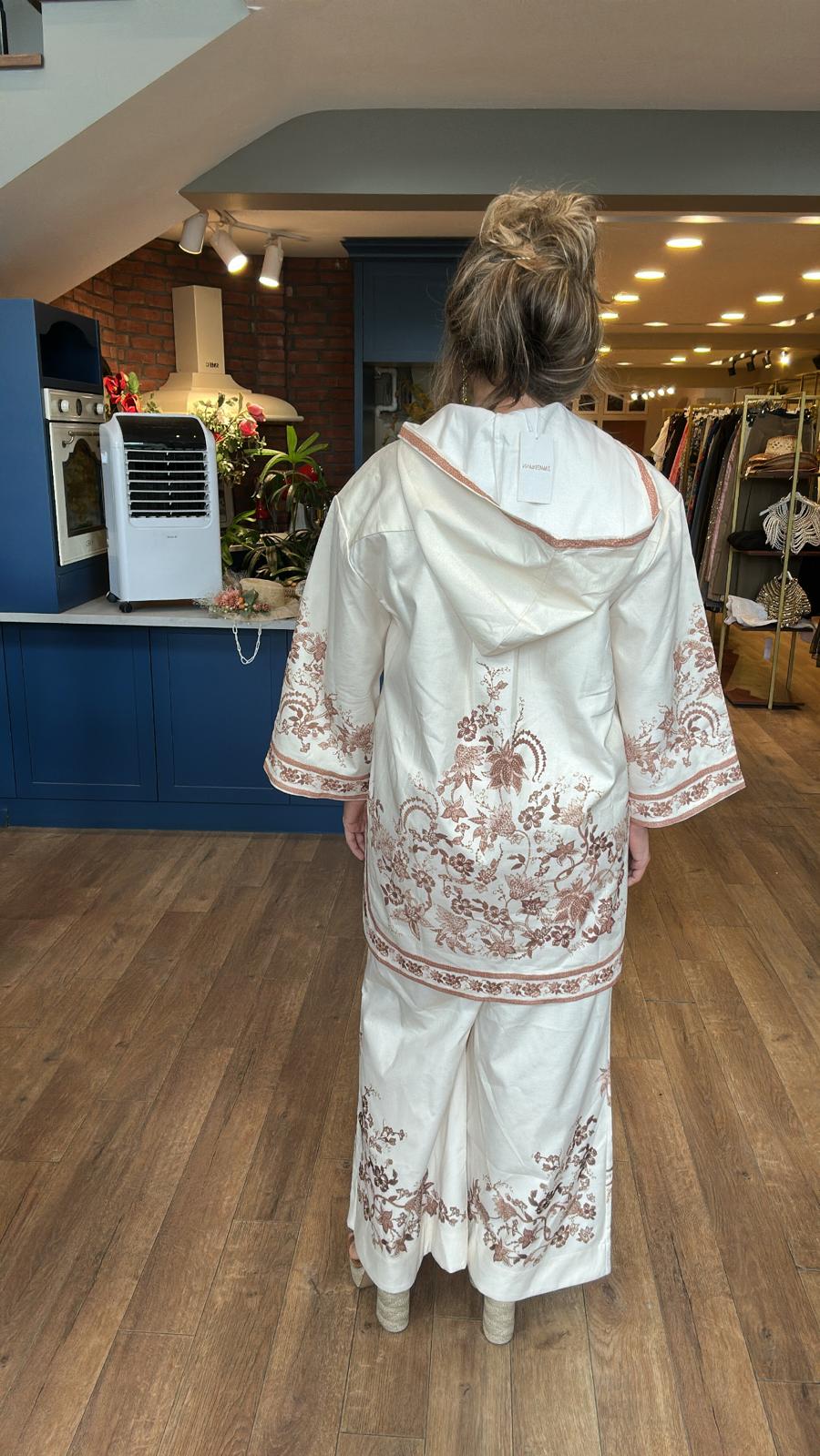 Desenli Keten Kapüşonlu Tunik Pantolon Takım