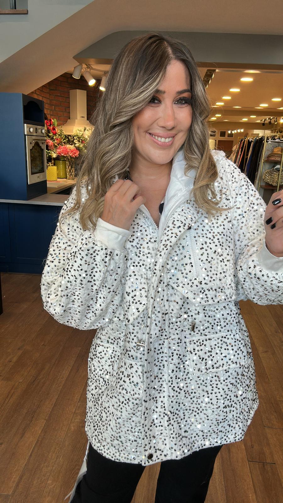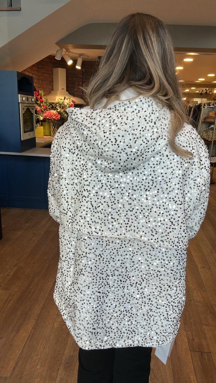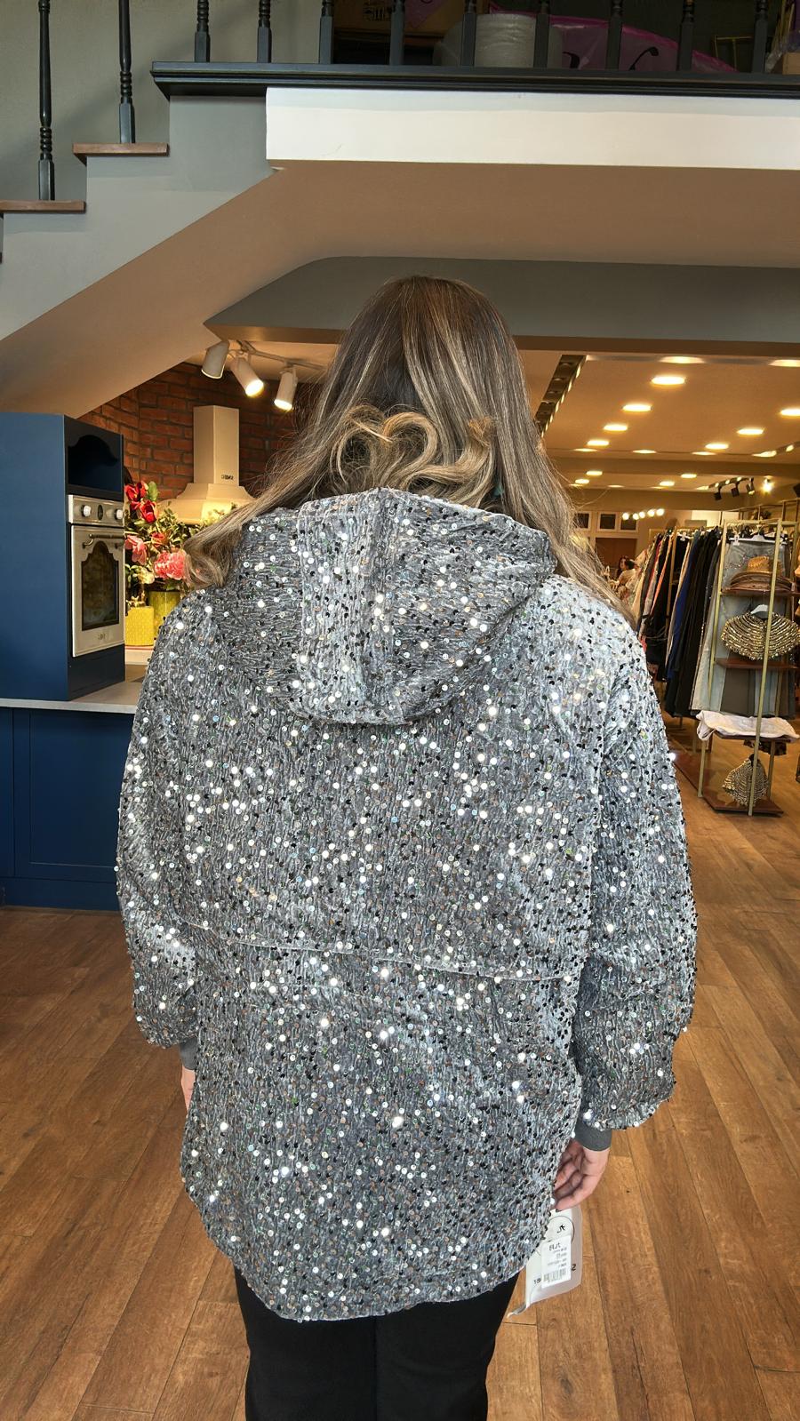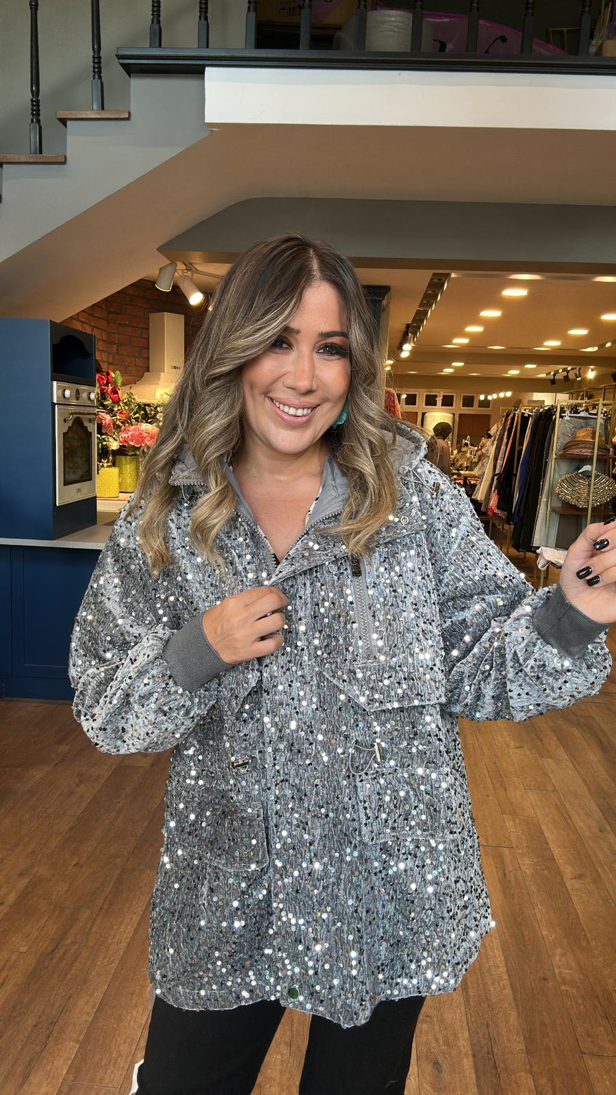 Kadife Kapüşonlu Pul İşlemeli Mont