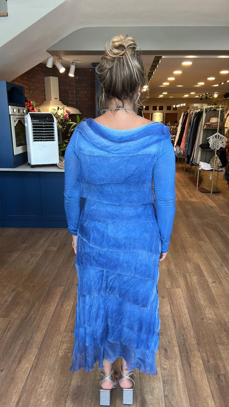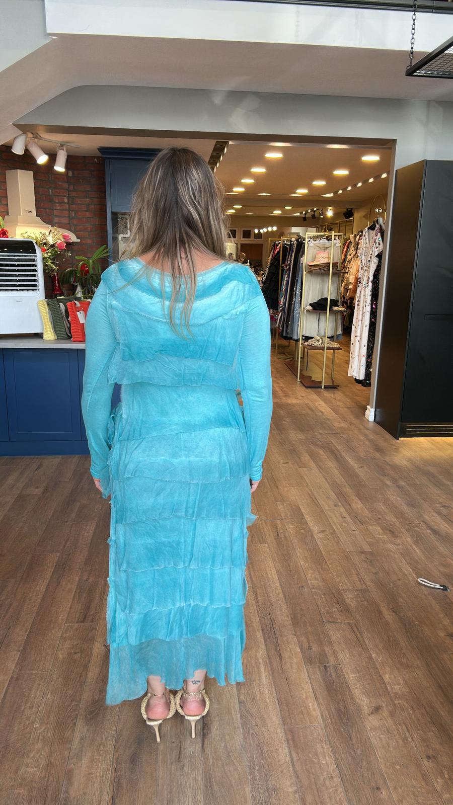 Katkat Uzun Kollu Mavi İpek Elbise