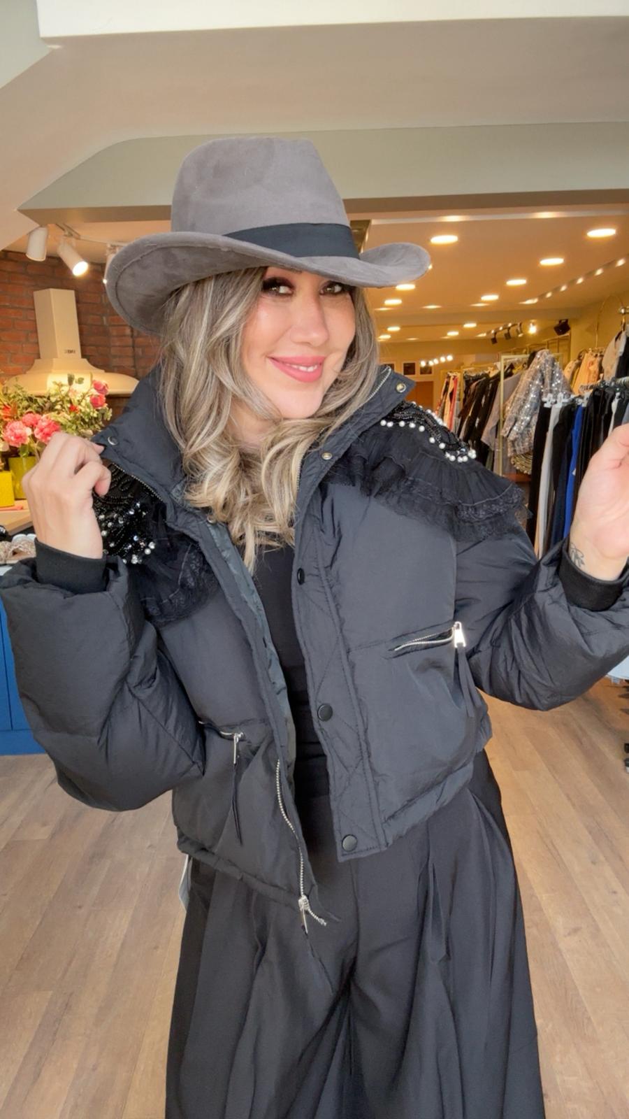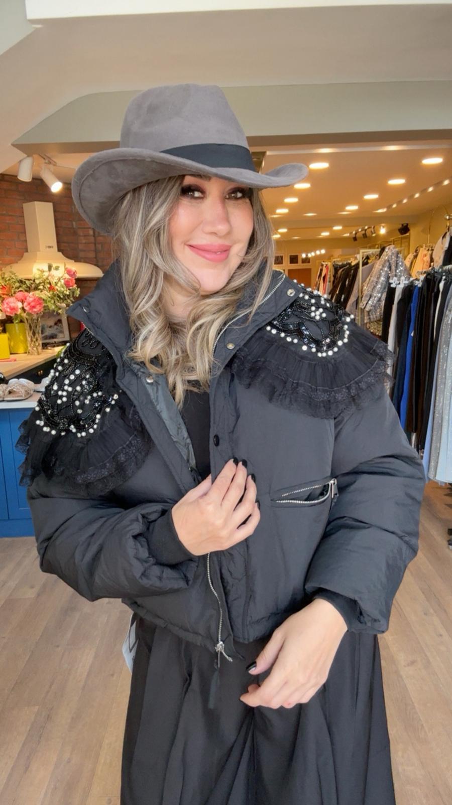 Omuzları Çiçek Motifli Kısa Mont