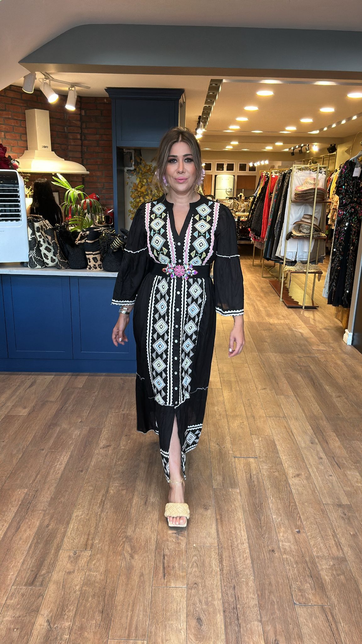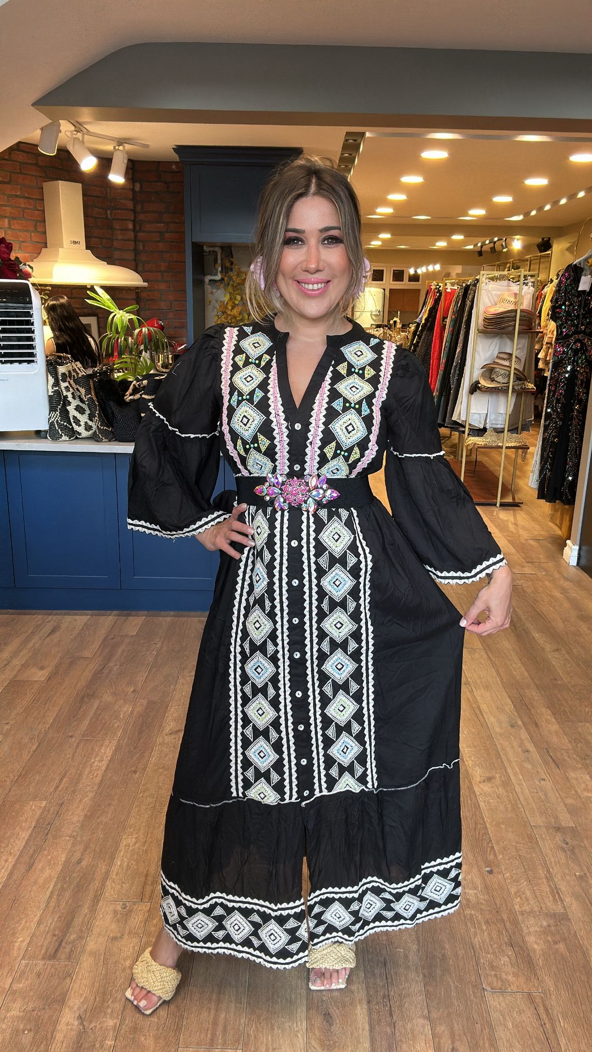Renkli İşlemeli İspanyol Kol Elbise