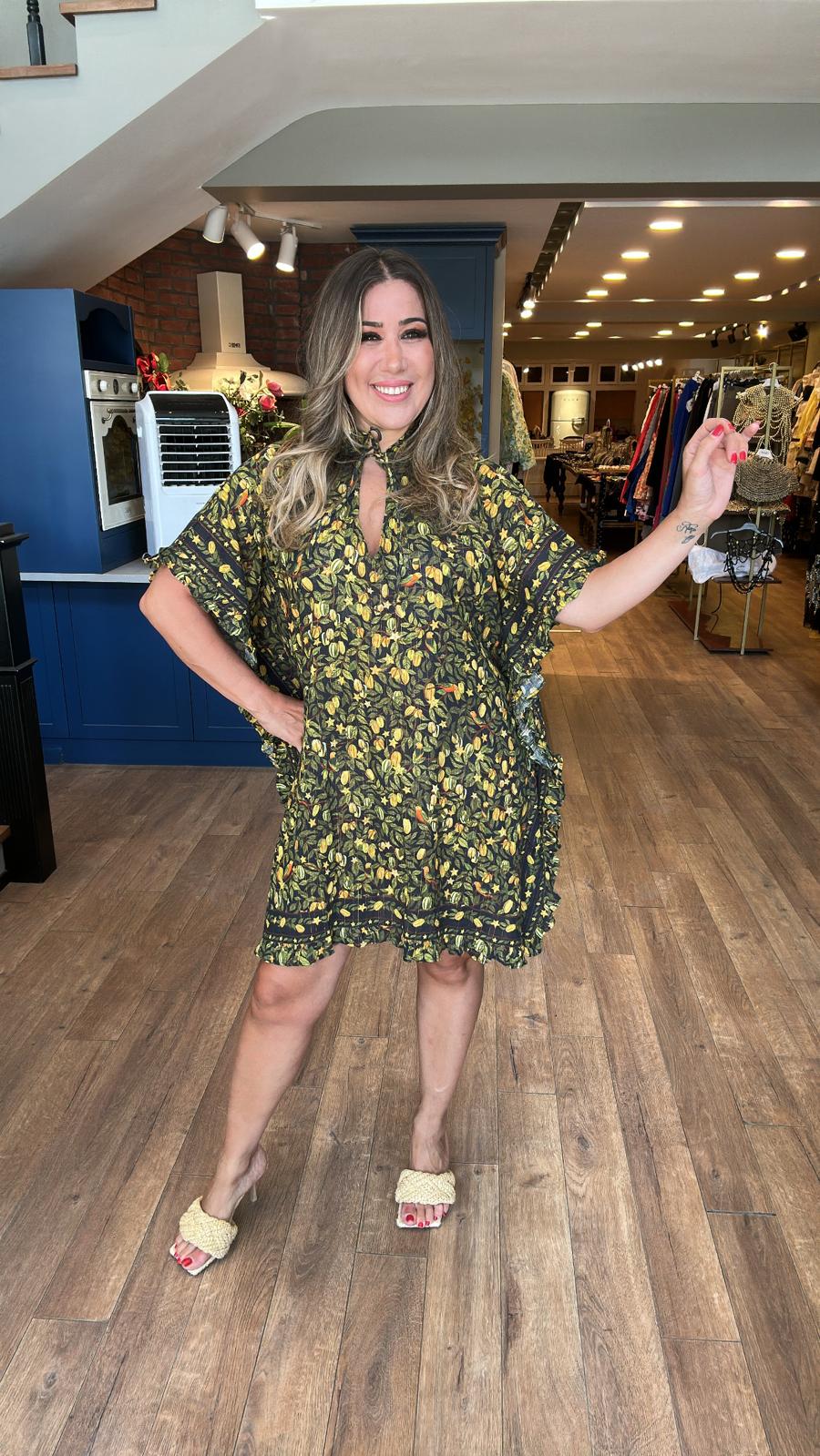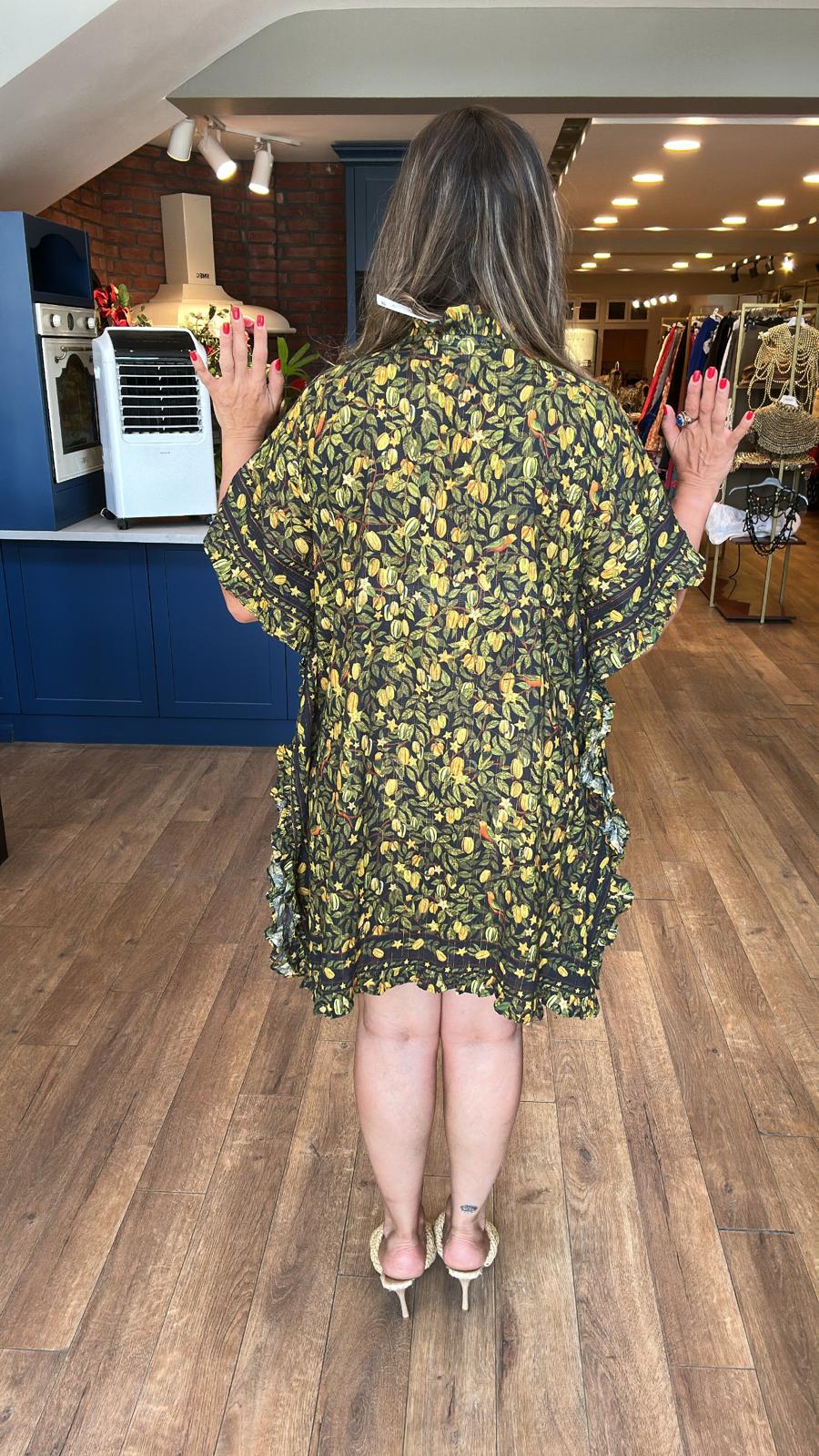 Sarı Yeşil Desenli Kısa Panço Elbise