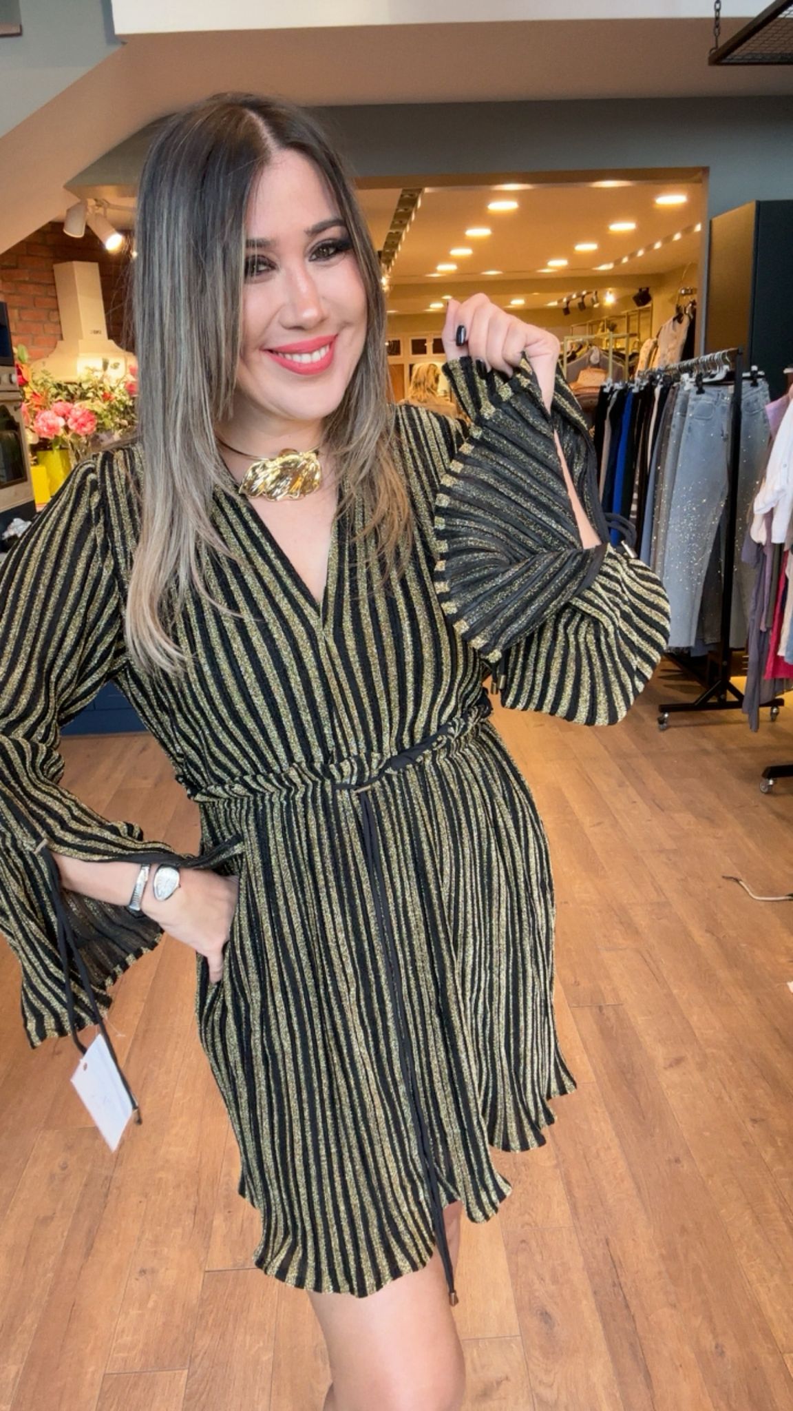 Simli Gold Çizgili Kısa Elbise