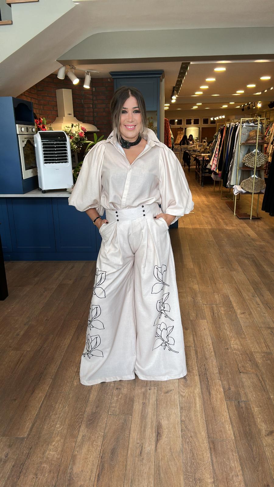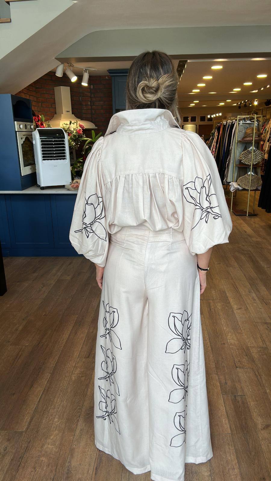 Siyah Çiçek Baskı Desen Pantolonlu Takım