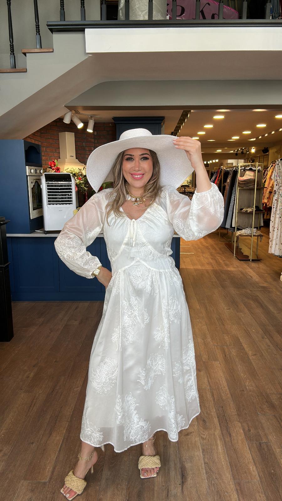 Yakası Lastikli Bel Bağlamalı İşlemeli Krem Elbise