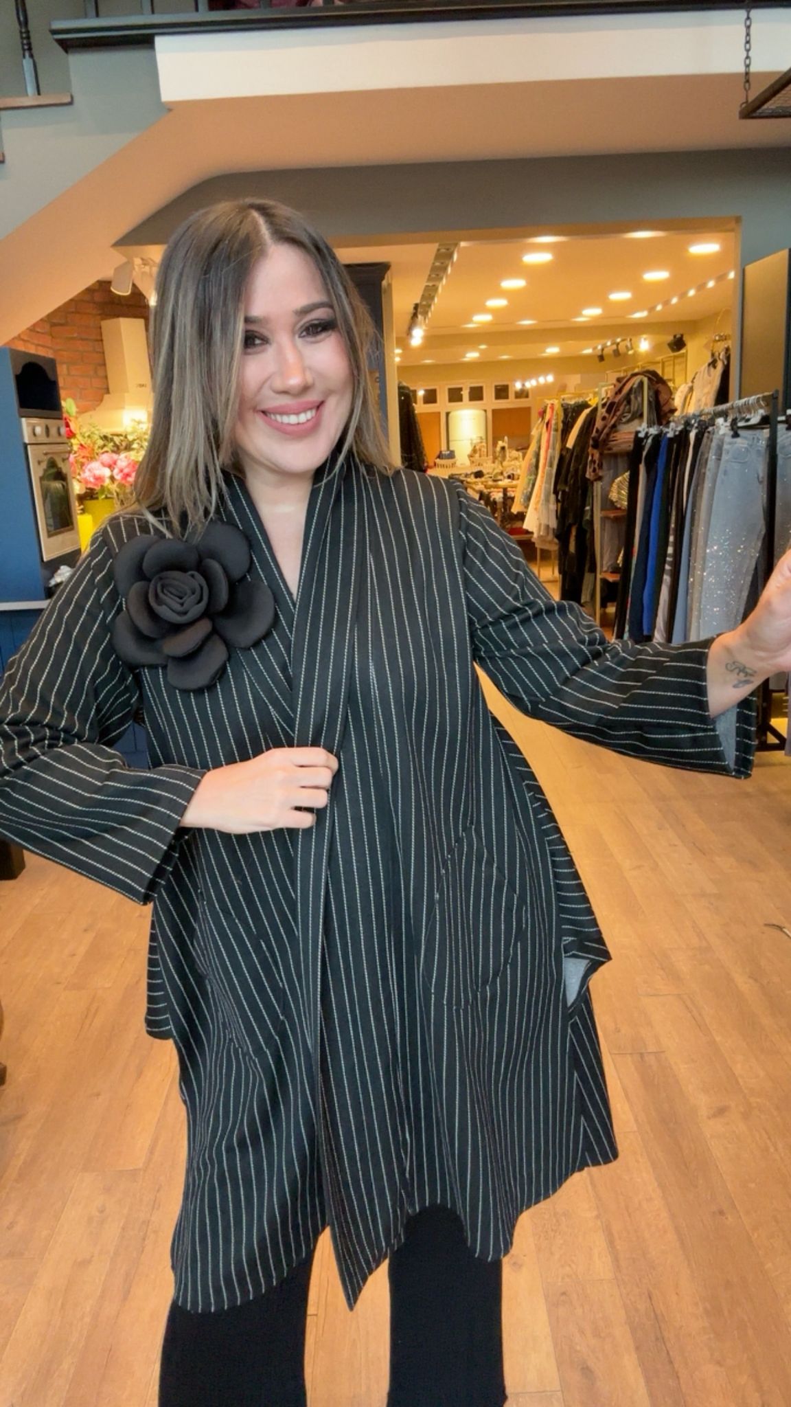 Çizgili Yakası Gül Detaylı Ceket