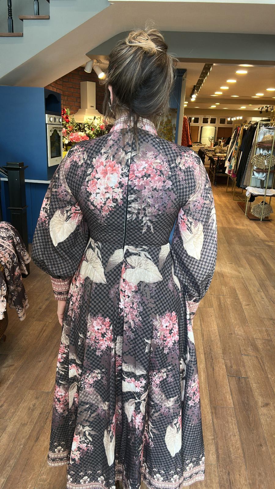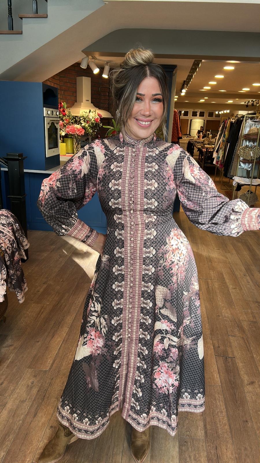 Kahverengi Desenli Önü Düğmeli Elbise