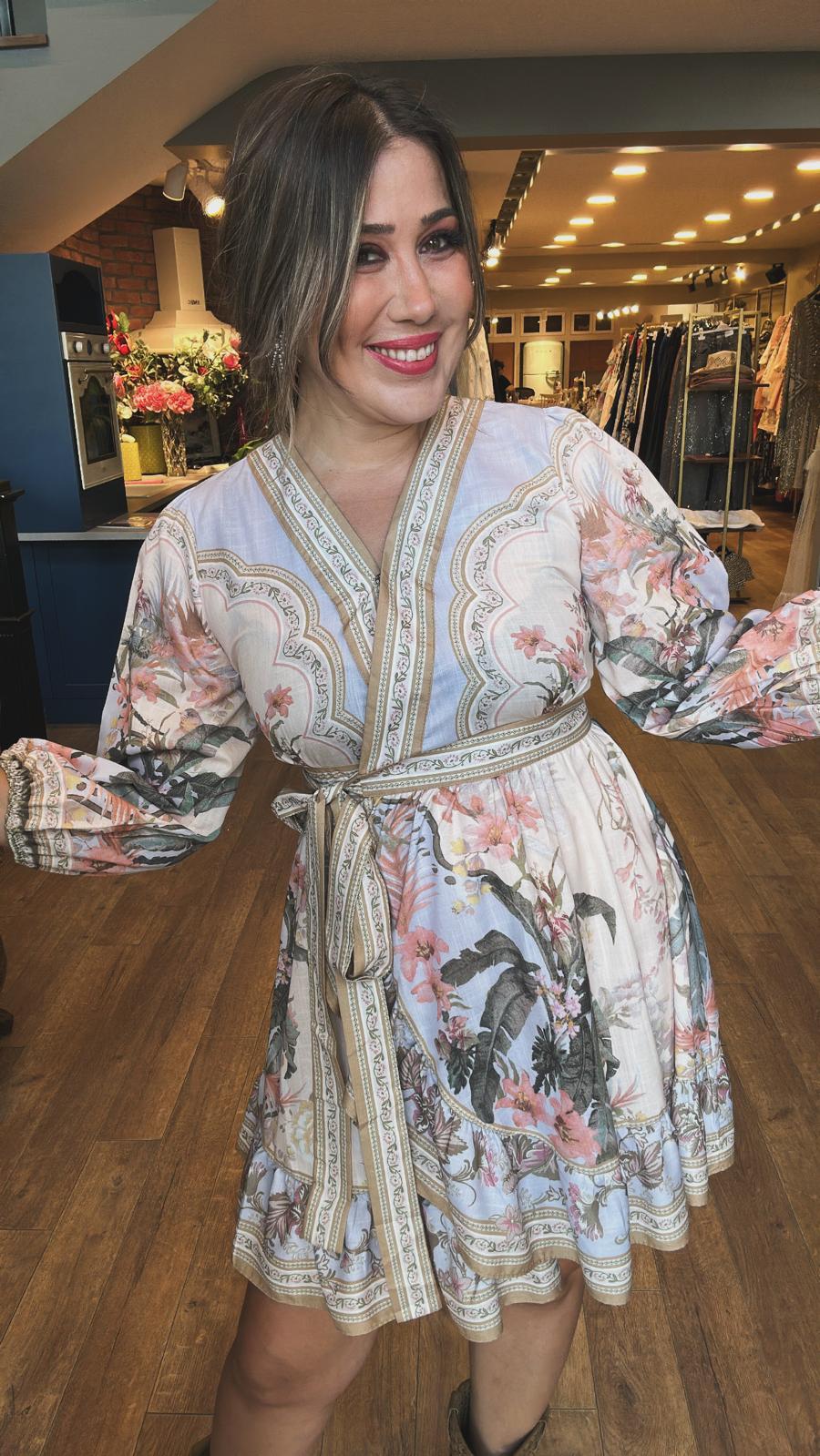 Kendinden Bel Ayarlamalı Desenli Kısa Elbise