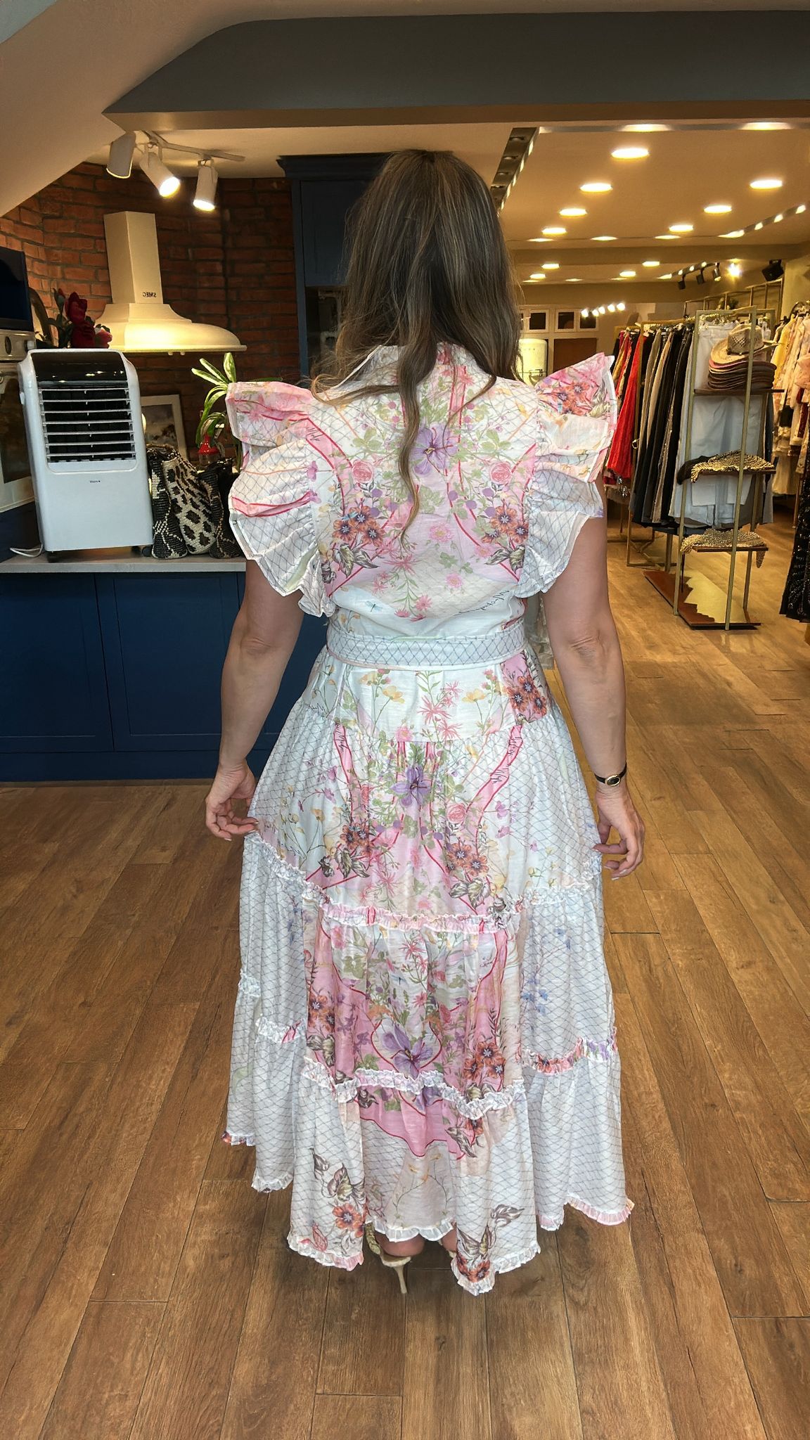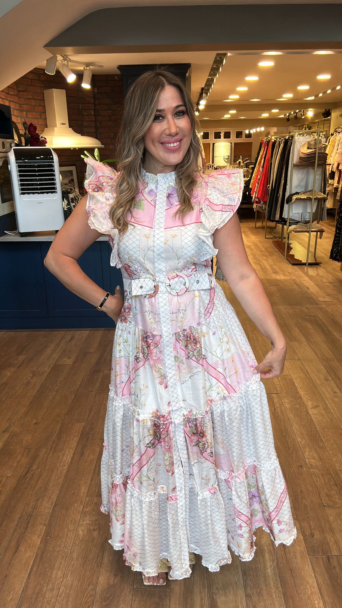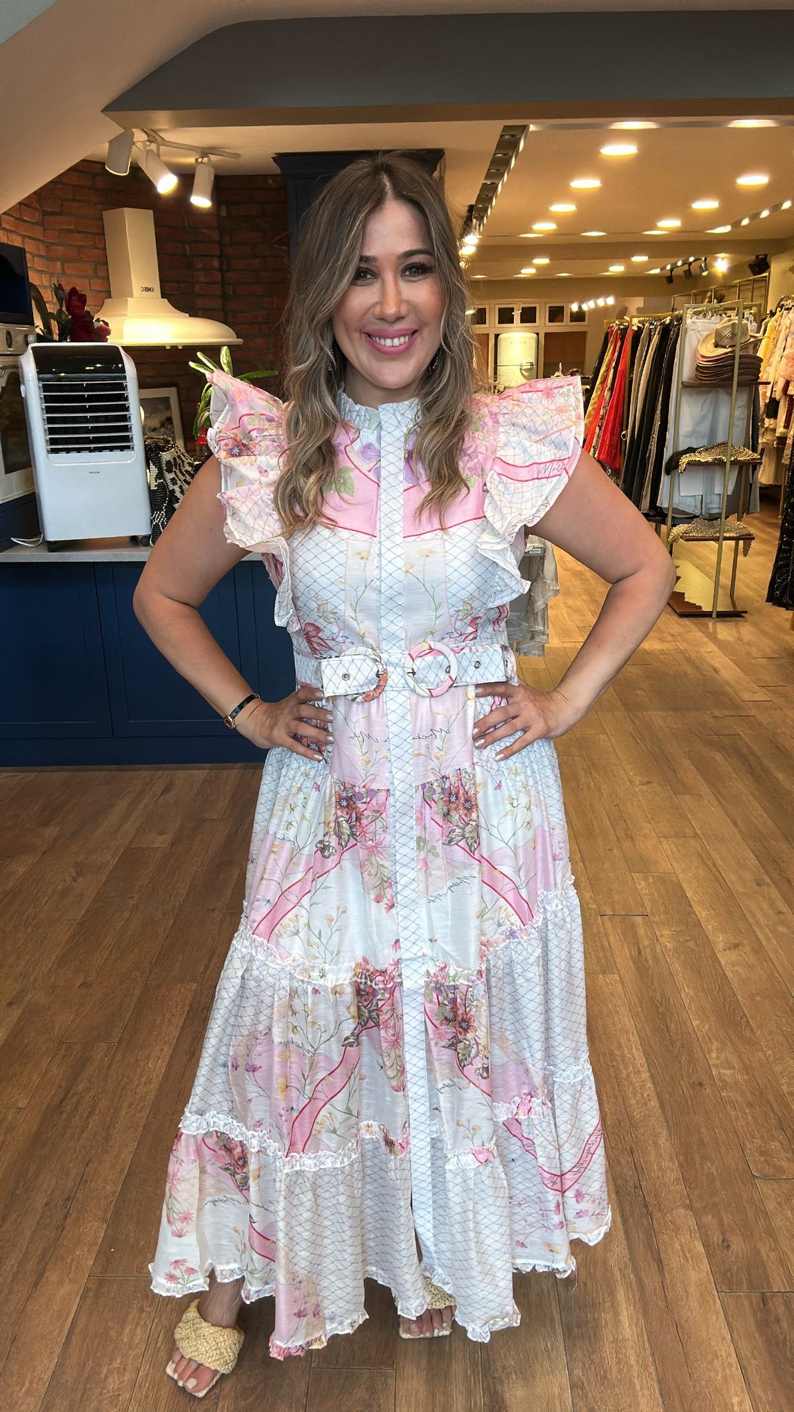 Kolları Fırfırlı Kemerli Uzun Pembe Elbise