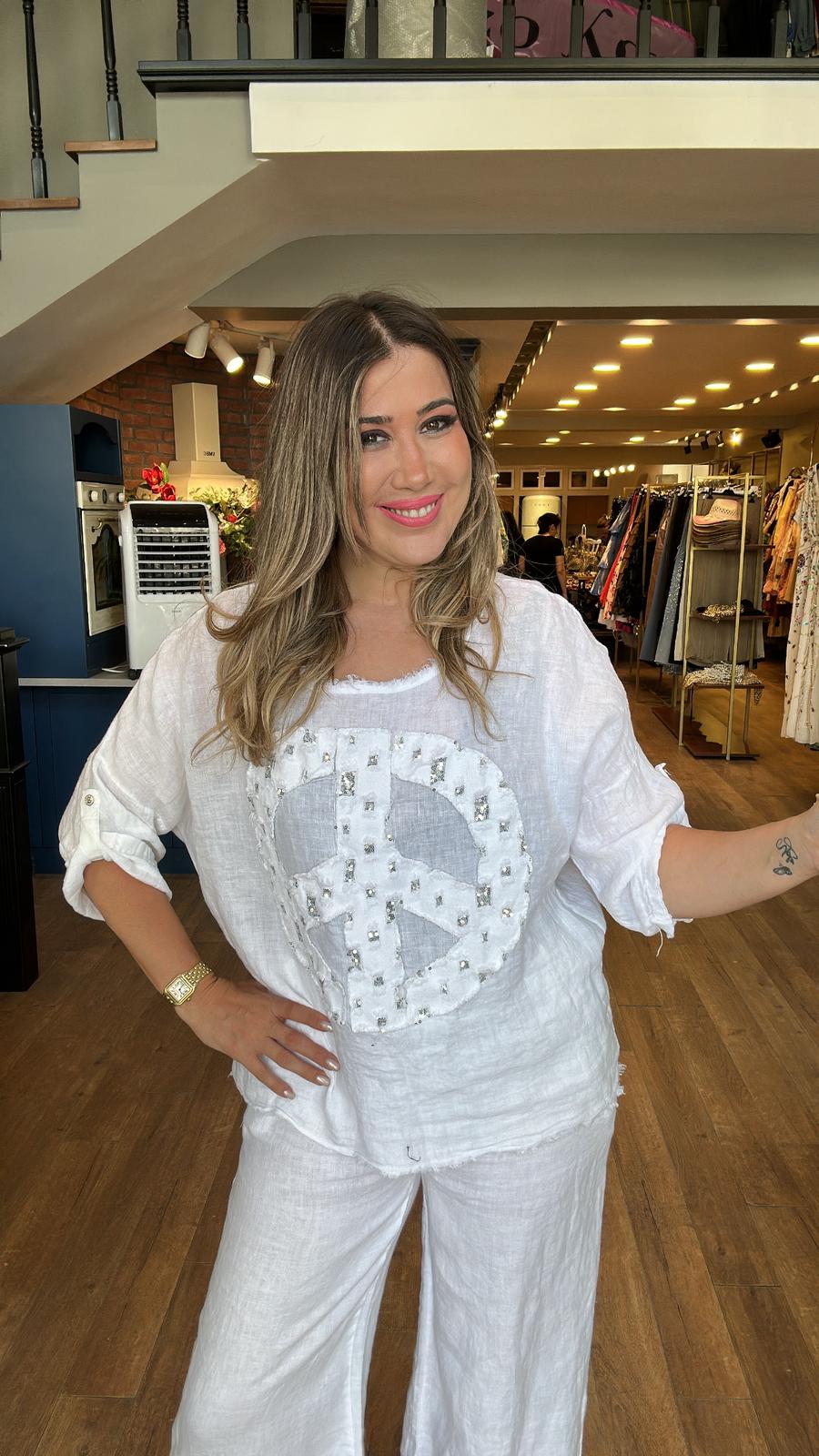 Önü Pul İşlemeli Beyaz Pantolonlu Keten Takım