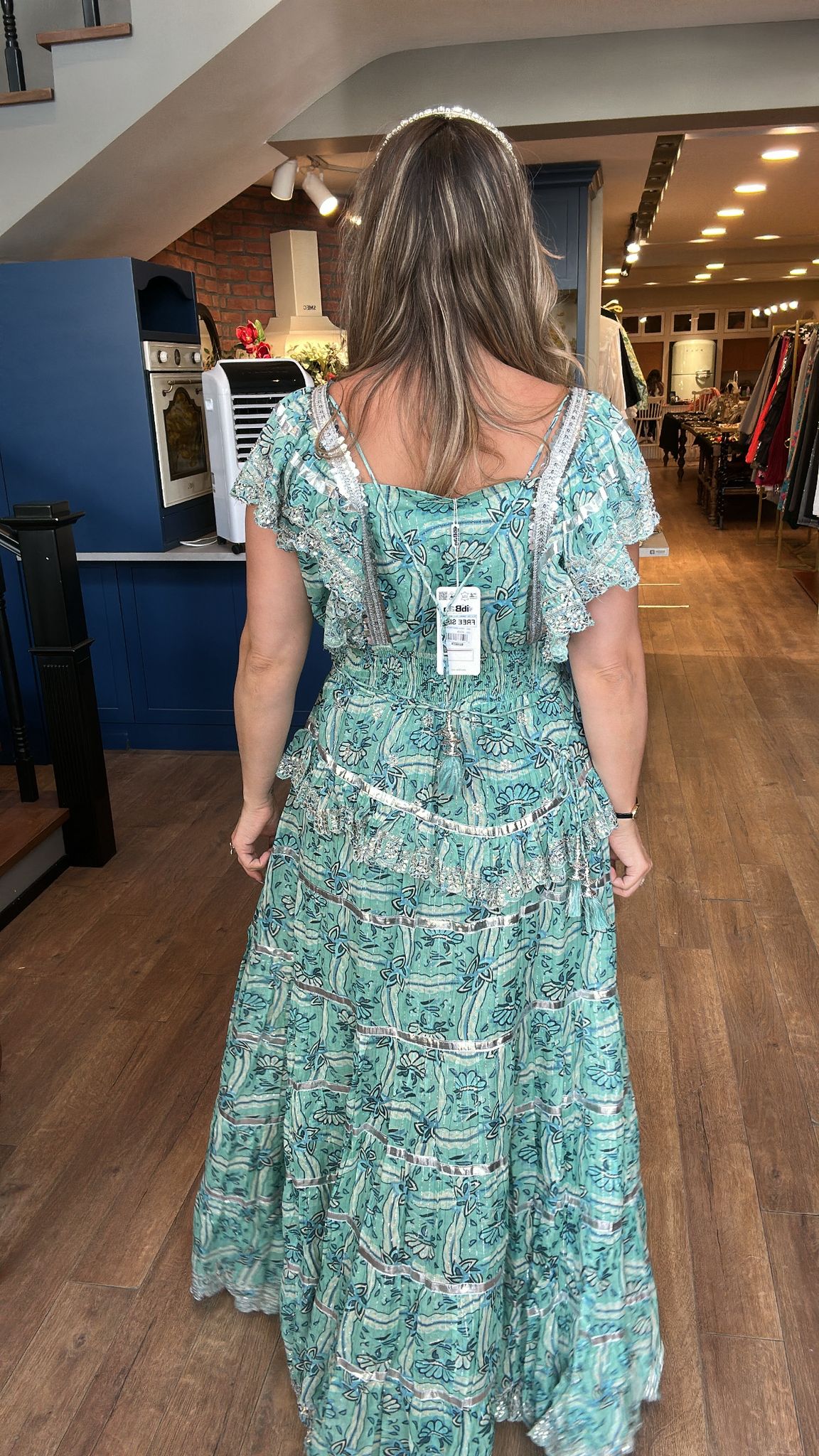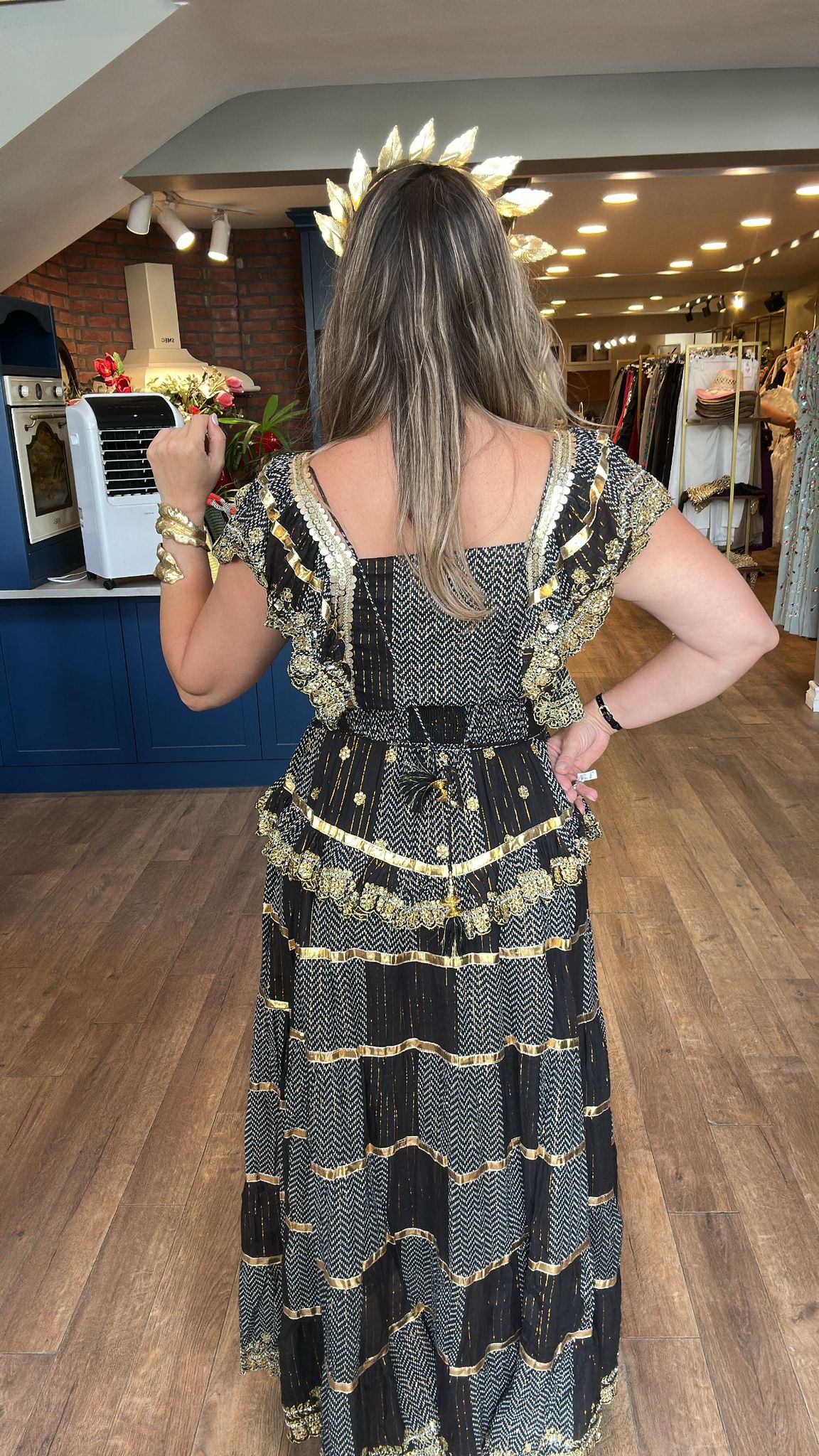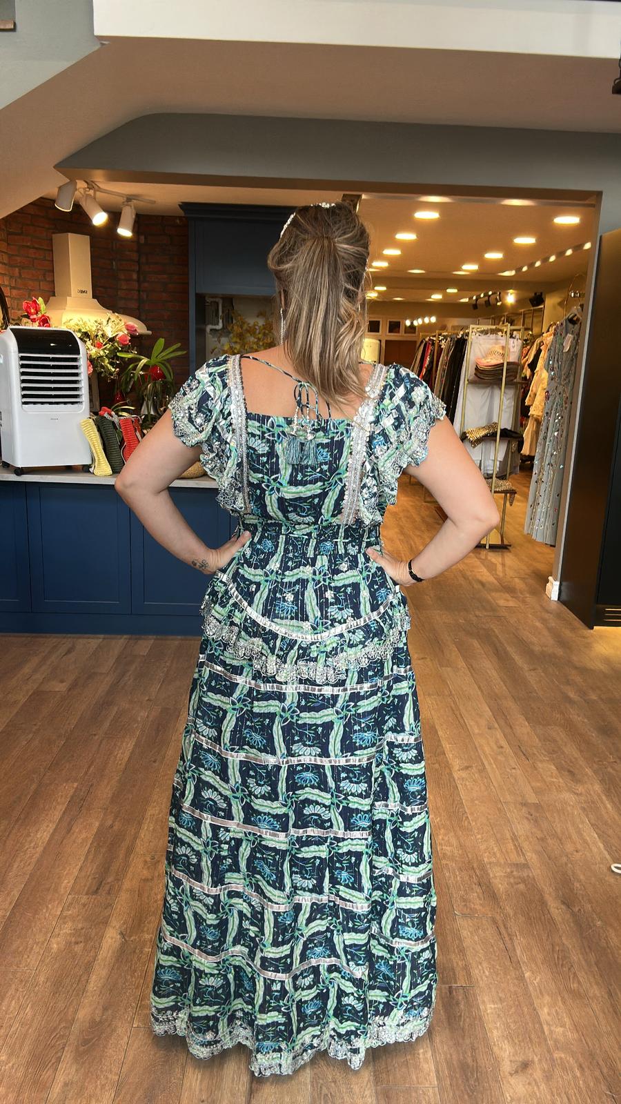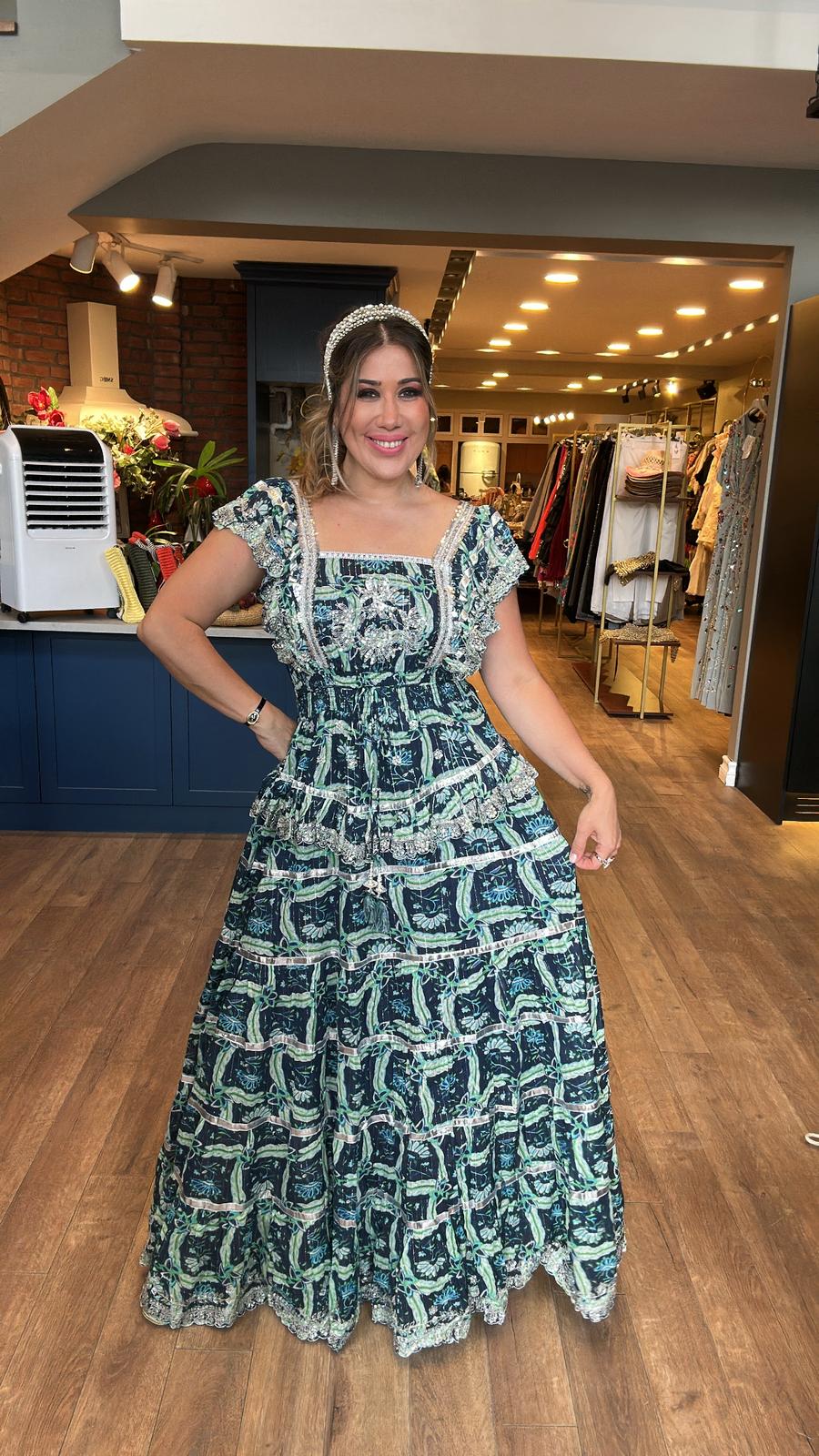 Parlak Sim Detaylı Desenli Uzun Abiye Elbise