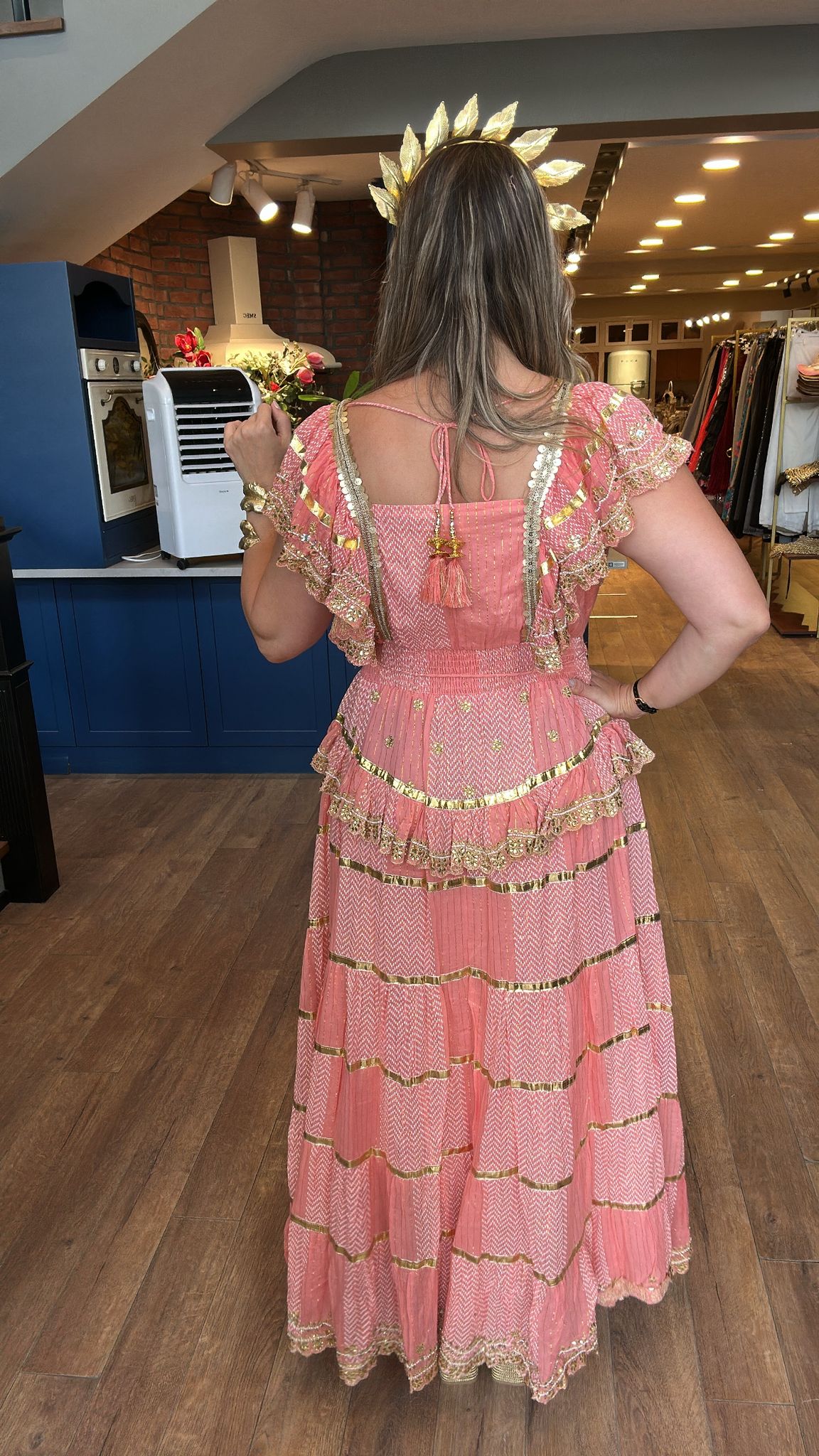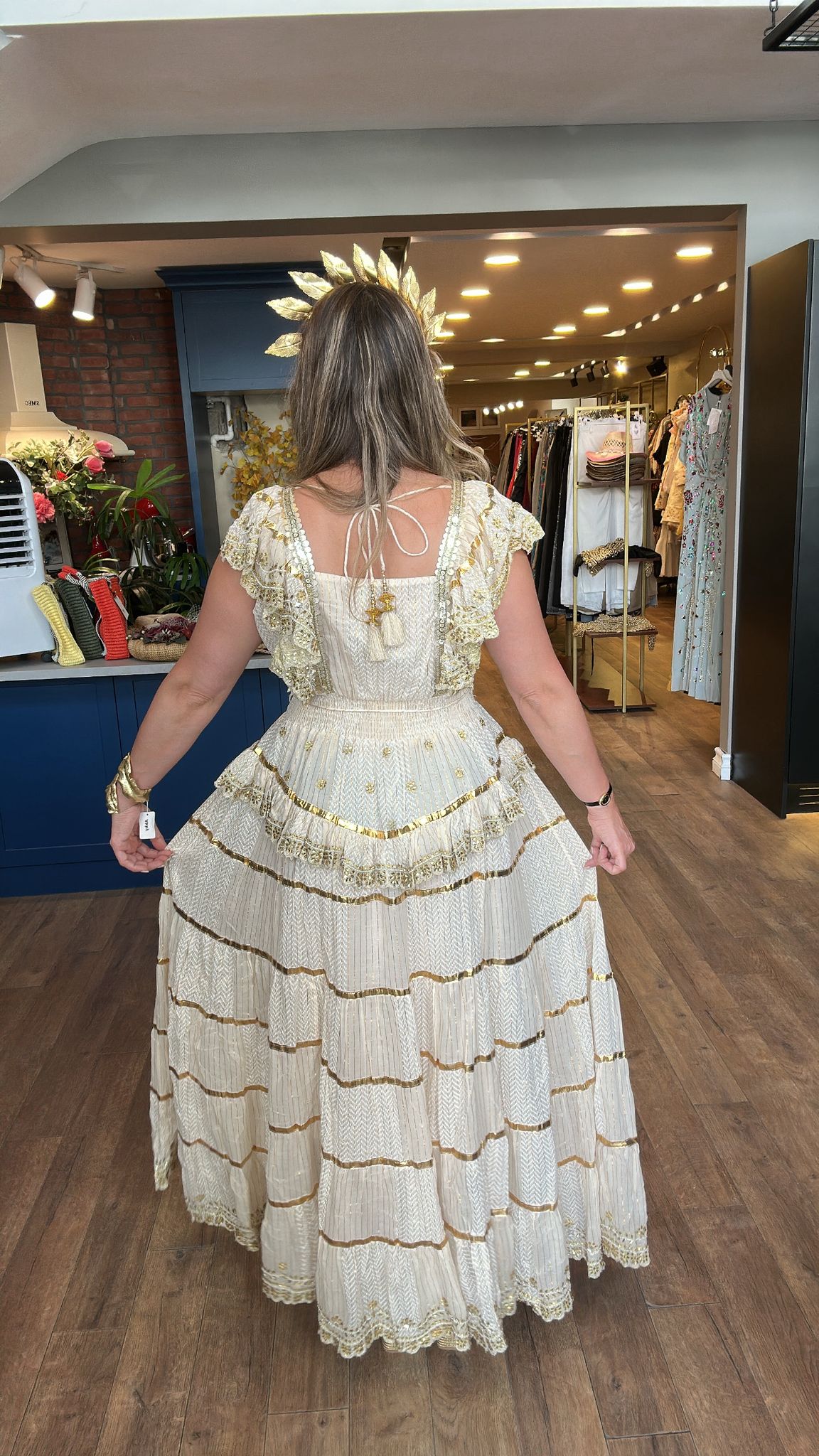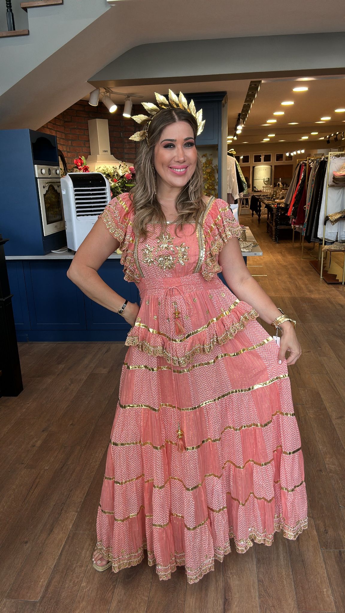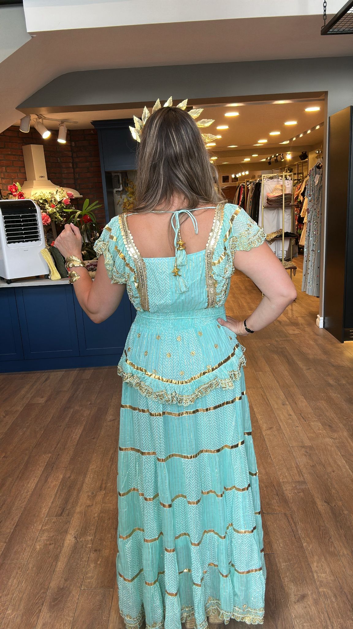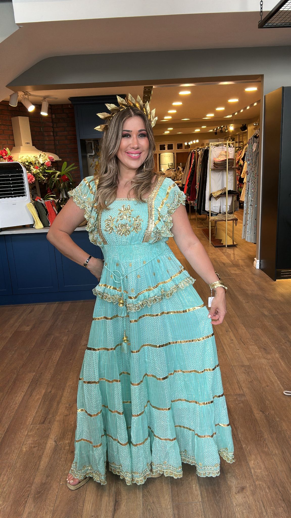 Parlak Sim Detaylı Desenli Uzun Abiye Elbise