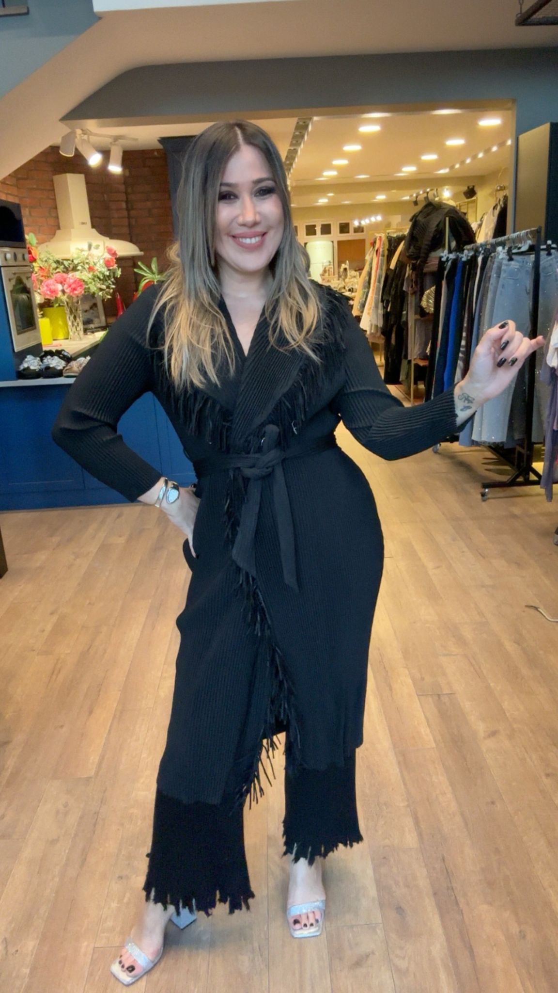 Saçaklı Belden Kuşaklı Uzun Ceket