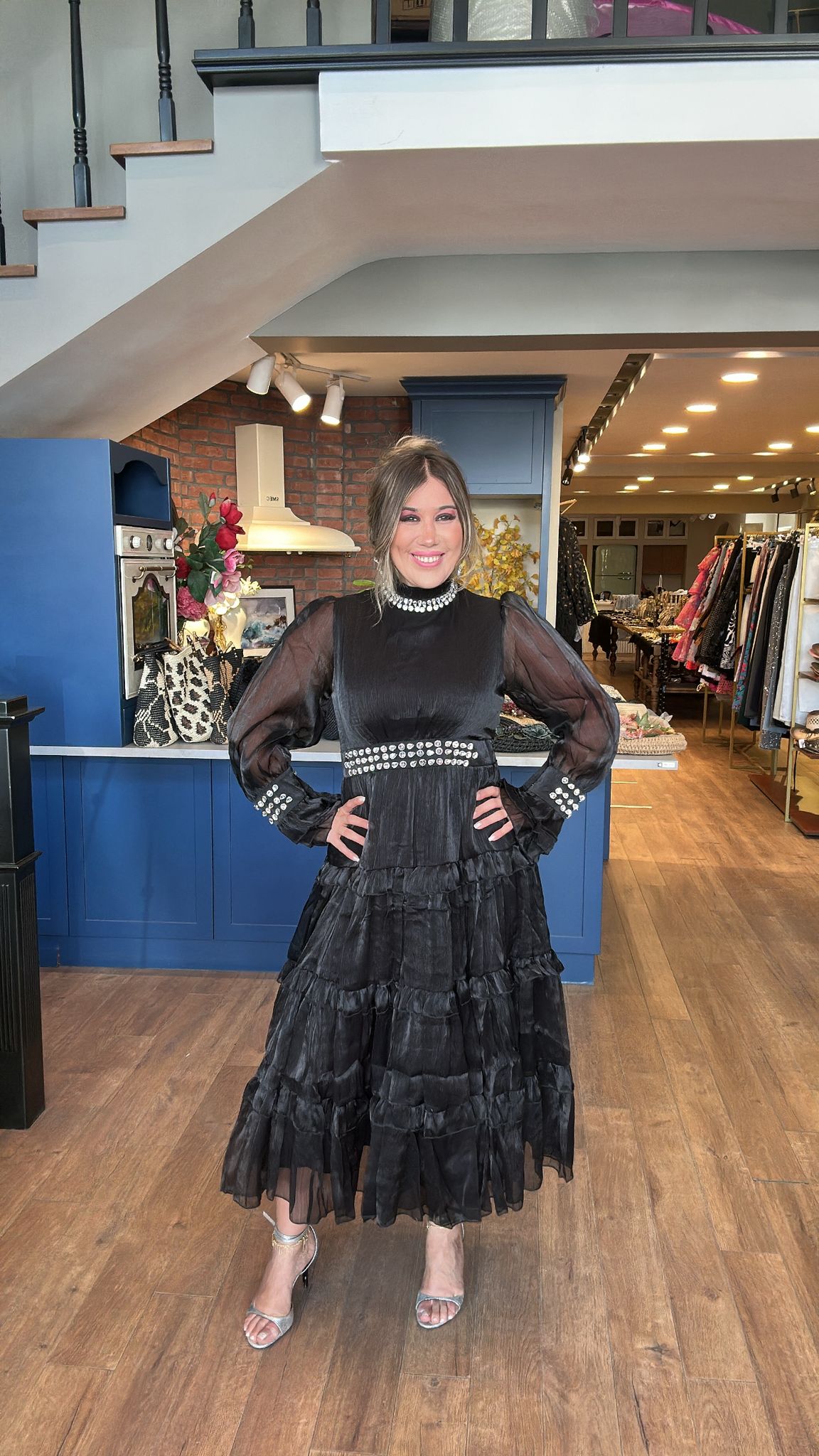 Yaka ve Bel Taşlı Uzun Elbise